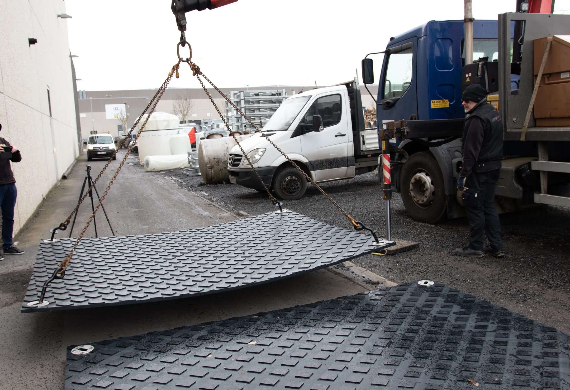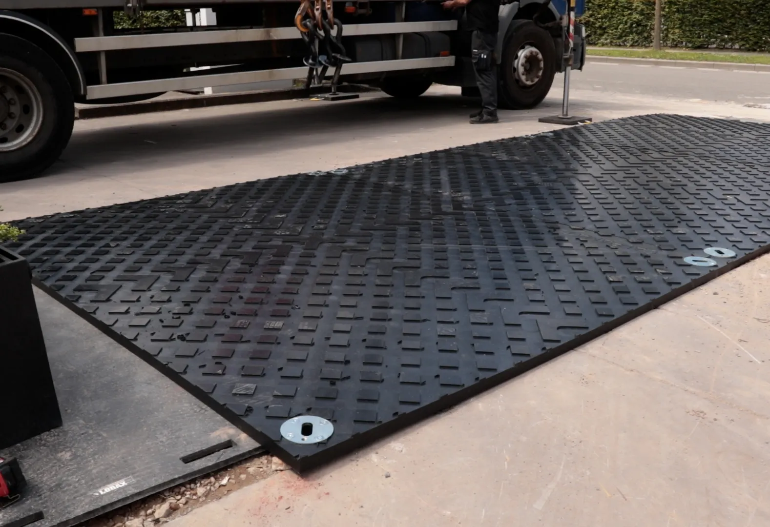 Bovendien zijn de platen door hun gewicht van 195 kg robuust genoeg om op hun plek te blijven liggen tijdens intensief gebruik door zware voertuigen.