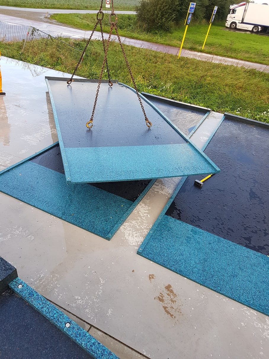 Om de vloer te beschermen kan er een HMPE (hoog moleculair polyethyleen) plaat op de bestrating gelegd worden.